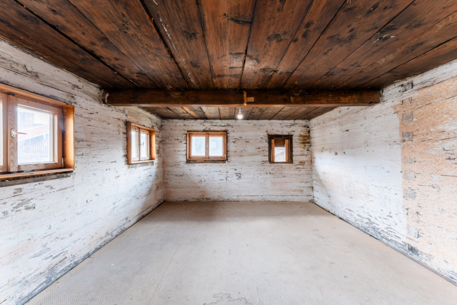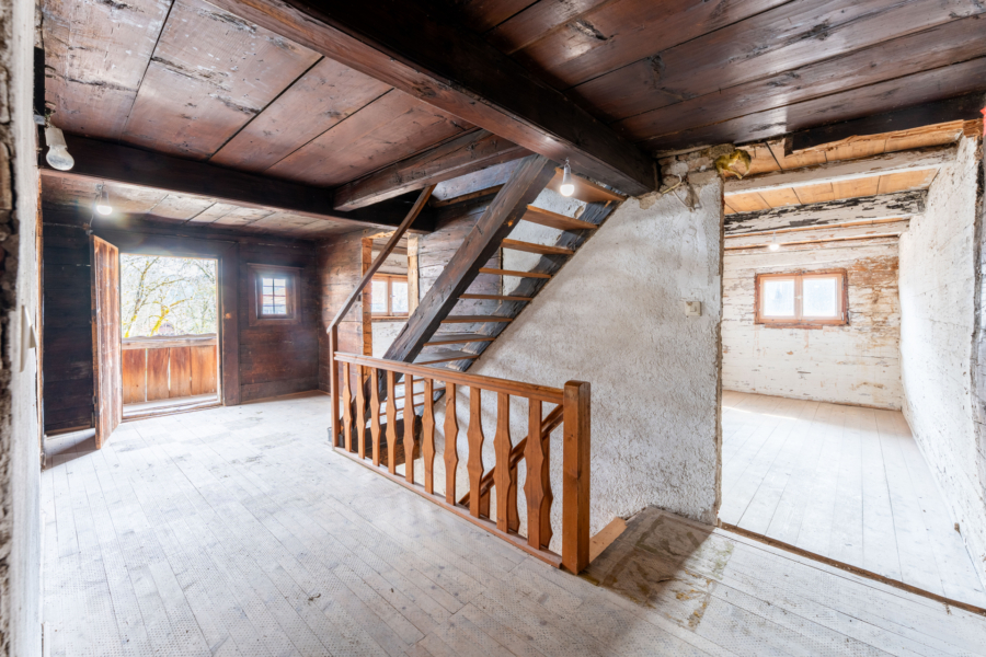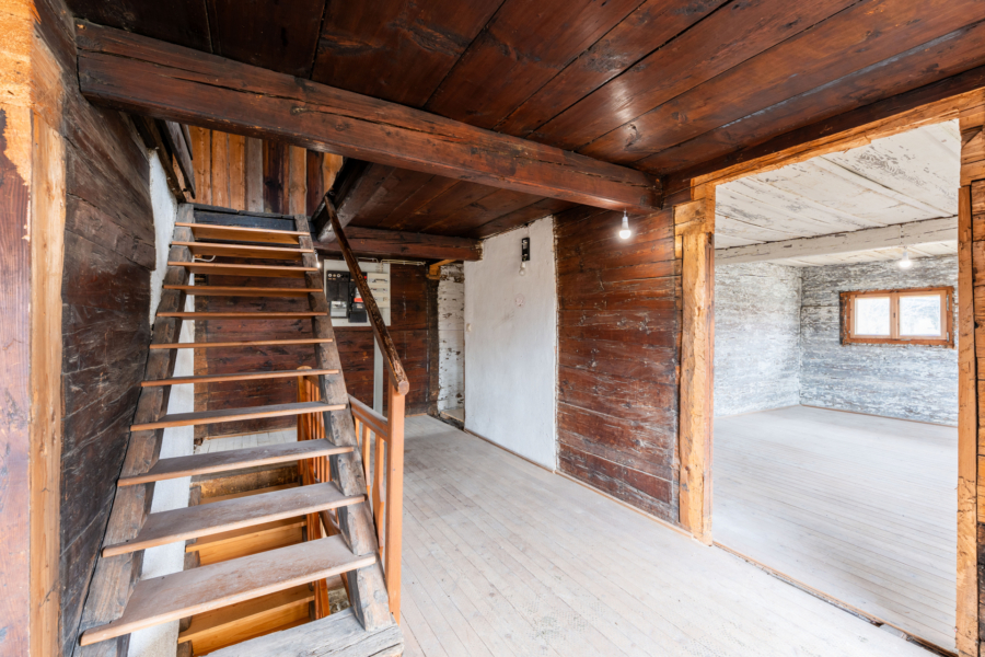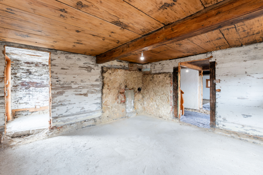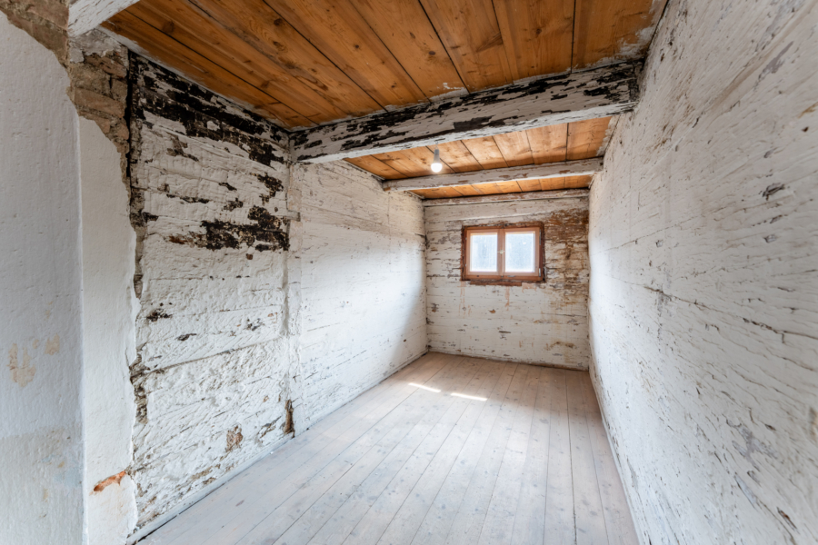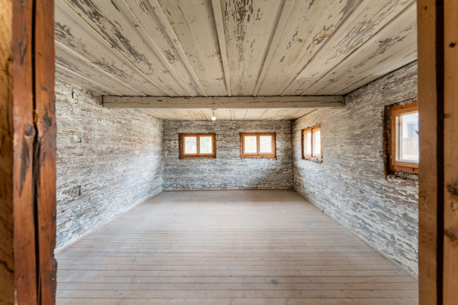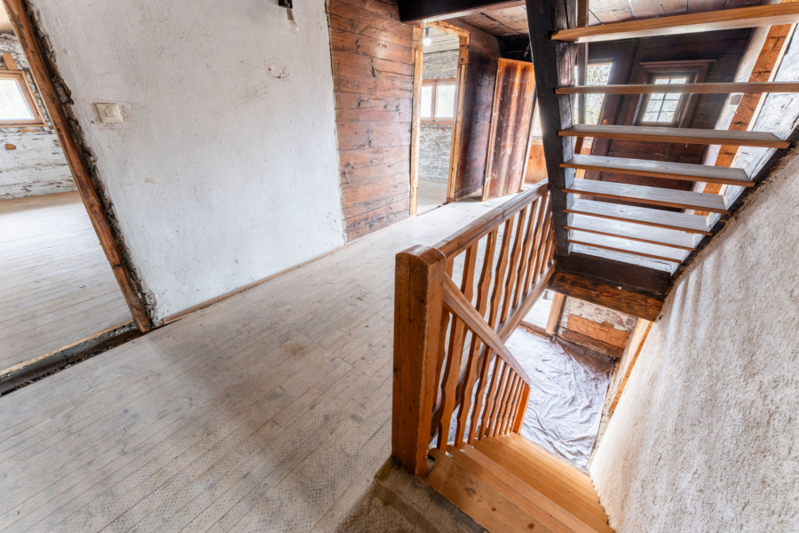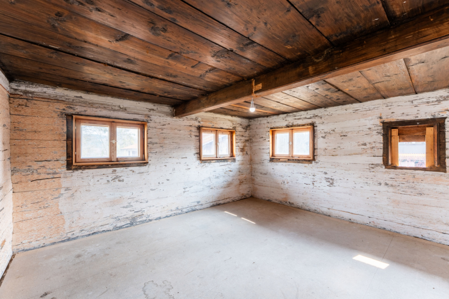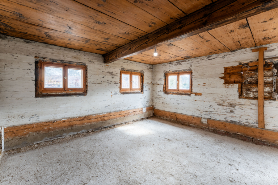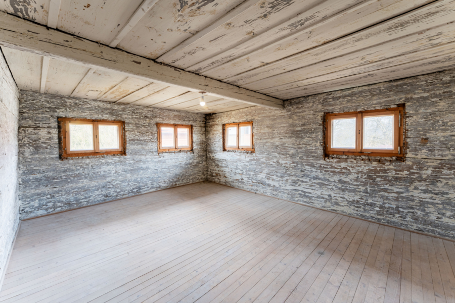 Der denkmalgeschützte Wohnteil (bez. 1728) bleibt als Herzstück des Ensembles erhalten. Durch eine fachgerechte Kernsanierung lassen sich hier Räume mit unvergleichlicher Atmosphäre schaffen – sichtbare Holzblockwände, historische Deckenbalken und das besondere Raumklima eines Massivholzbaus inklusive.