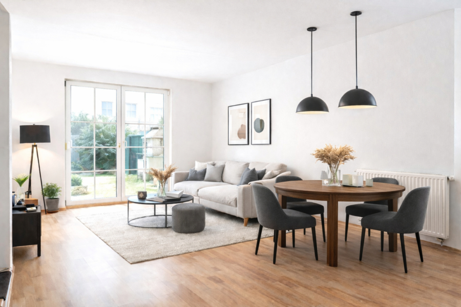 Das Herzstück des Hauses ist der offene Wohn- und Essbereich im Erdgeschoss, der mit bodentiefen Fenstern viel Tageslicht hereinlässt und einen herrlichen Blick in den Garten bietet. Die separate Einbauküche ist ideal für Hobbyköche und lädt zum gemeinsamen Kochen und Genießen ein.