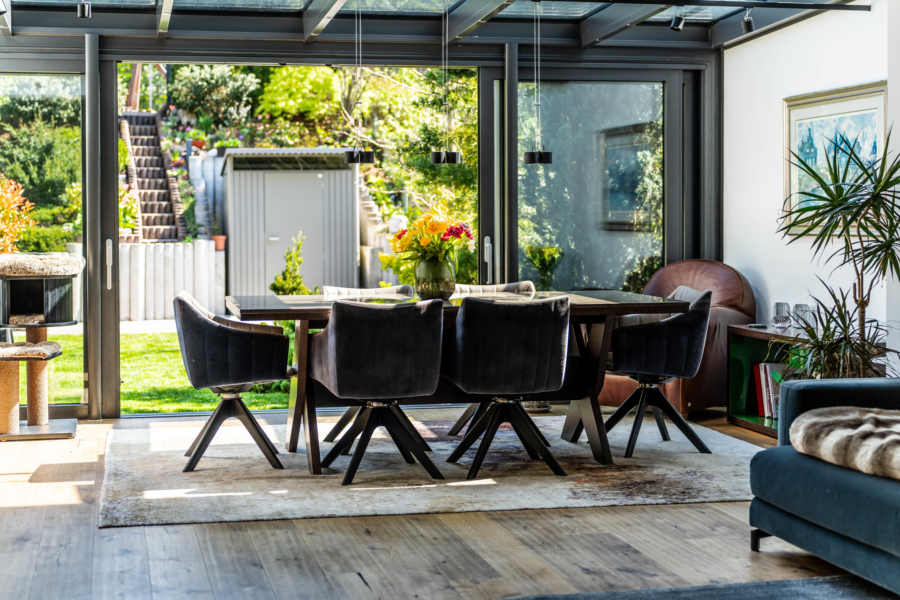 Die großzügige Raumaufteilung umfasst eine offene Küche mit luxuriösen Einbauten, die in das Wohnzimmer mit Wintergarten übergeht. Ein offener Kamin oder Ofen kann hier als gemütliches Highlight integriert werden. Der stilvoll angelegte Garten mit Gartenhaus und Spielbereich für Kinder lädt zu entspannten Stunden im Freien ein.