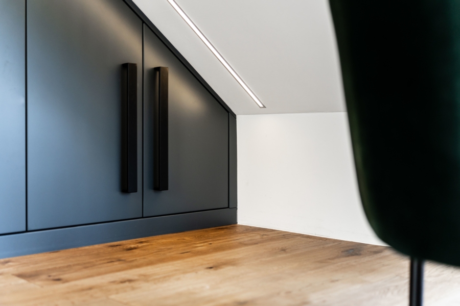 Das Obergeschoss bietet flexiblen Raum für Familien: Aktuell mit zwei Zimmern gestaltet, kann durch den Einzug einer Wand ein drittes Zimmer geschaffen werden. Ein hochwertiges Bad sowie die Möglichkeit und Genehmigung für den Anbau eines Balkons runden das Angebot ab. Das Dachgeschoss dient als privater Elternbereich mit einem weiteren Bad und einer Ankleide.