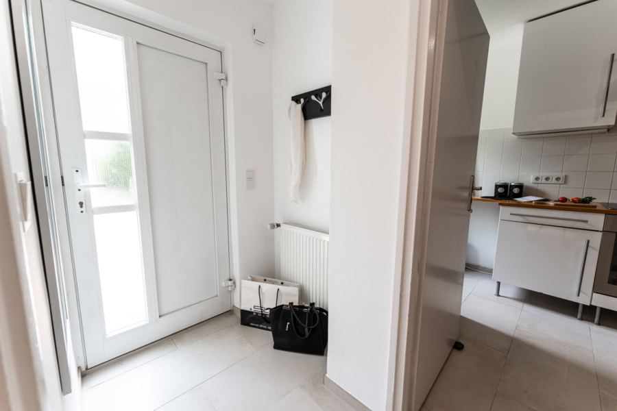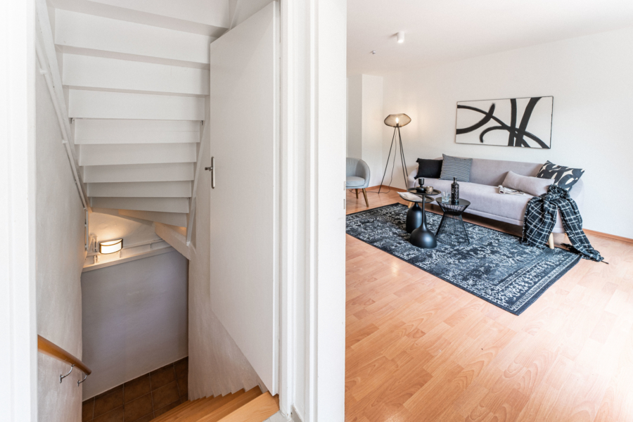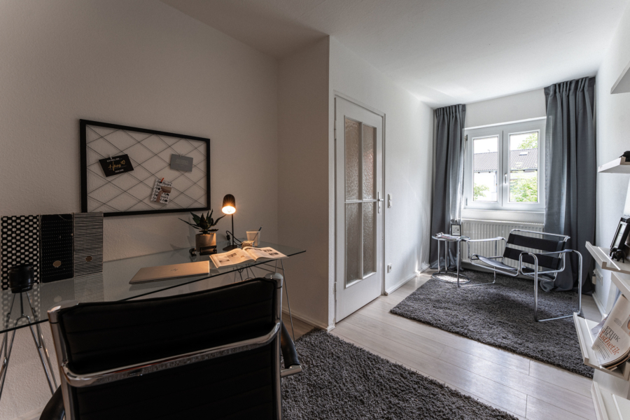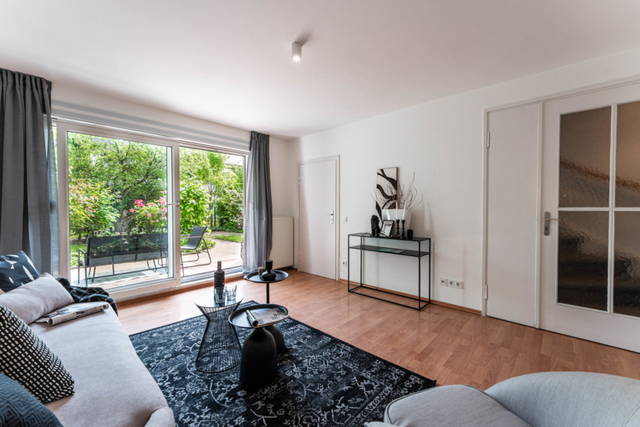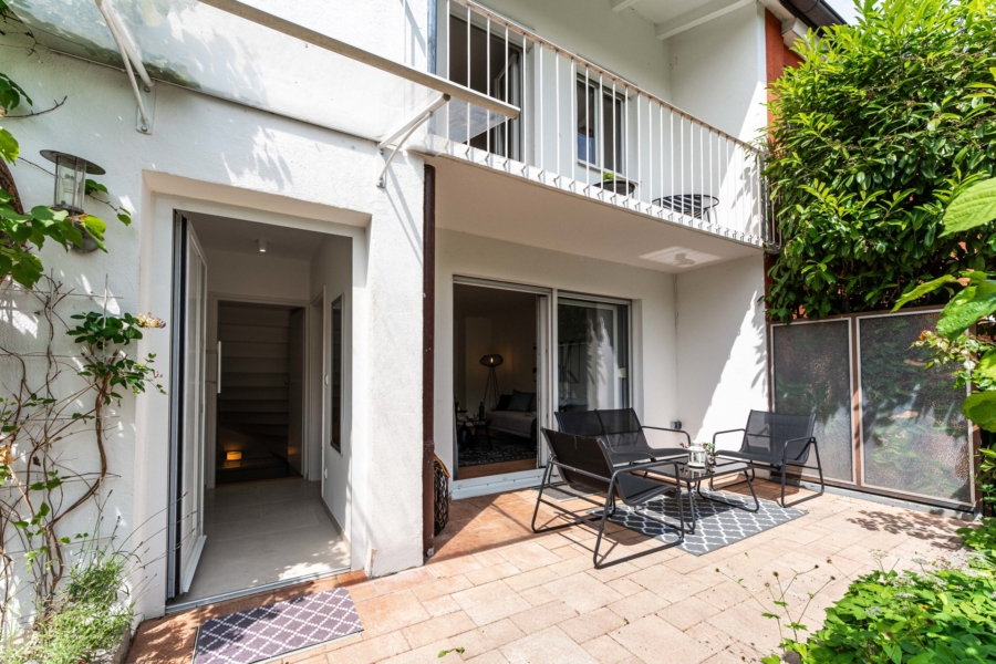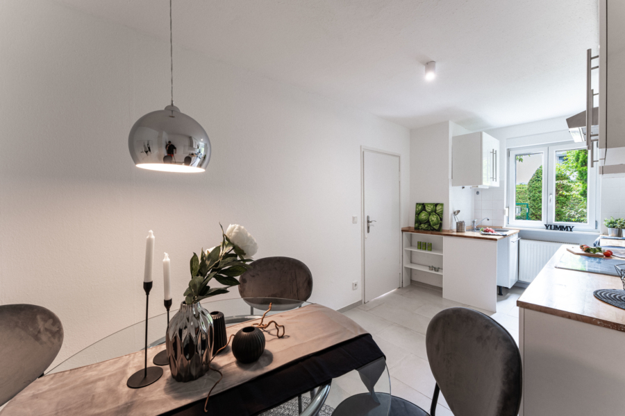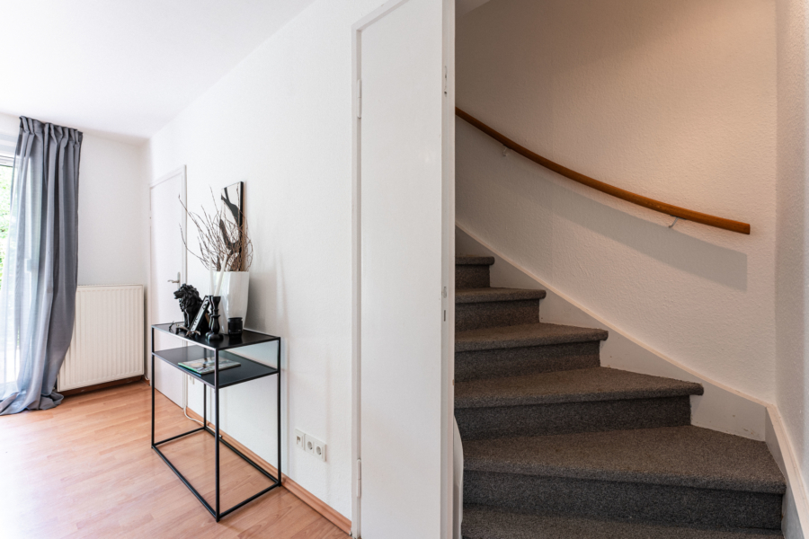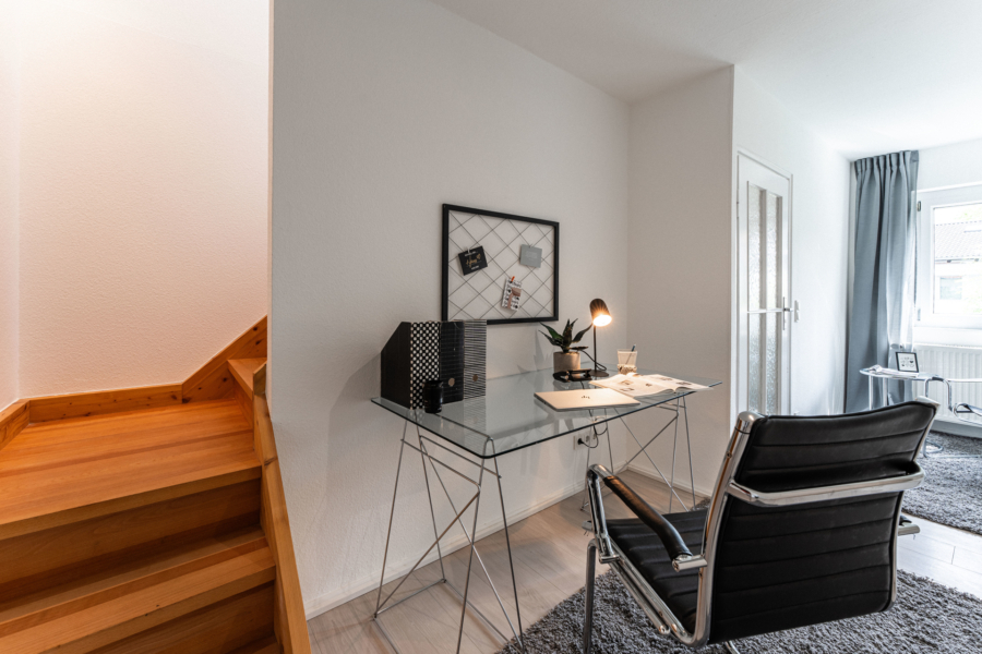 Im Erdgeschoss erwartet Sie ein heller Wohnbereich mit bodentiefen Fenstern, die den Blick direkt auf die gemütliche Terrasse und den gemütlichen, kaum einsehbaren Garten freigeben - ein wunderbarer Ort für entspannte Stunden im Freien. Ihre Kinder können hier sicher spielen, da nur ein Anliegerweg vor dem Haus verläuft. Die separate Küche ist funktional ausgestattet und bietet Platz für einen Essbereich.