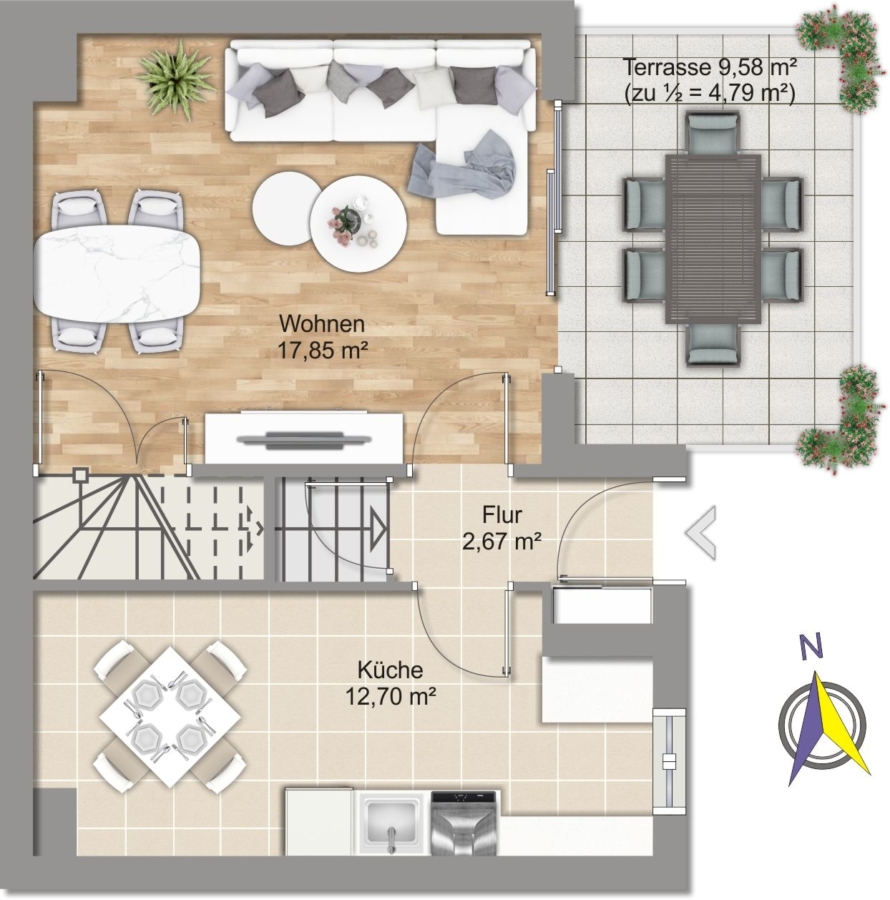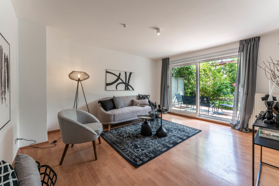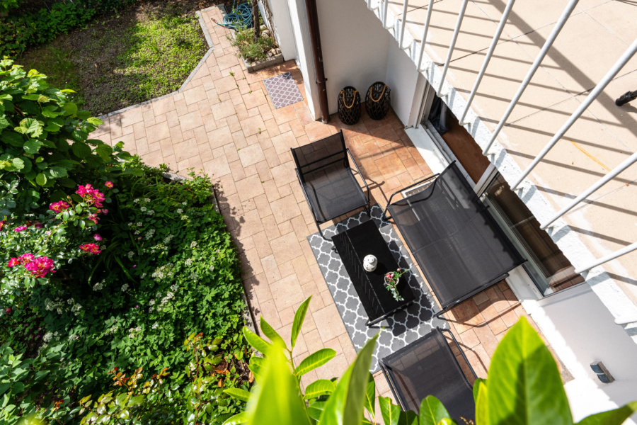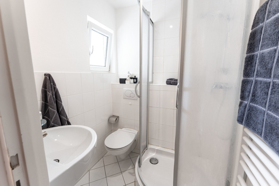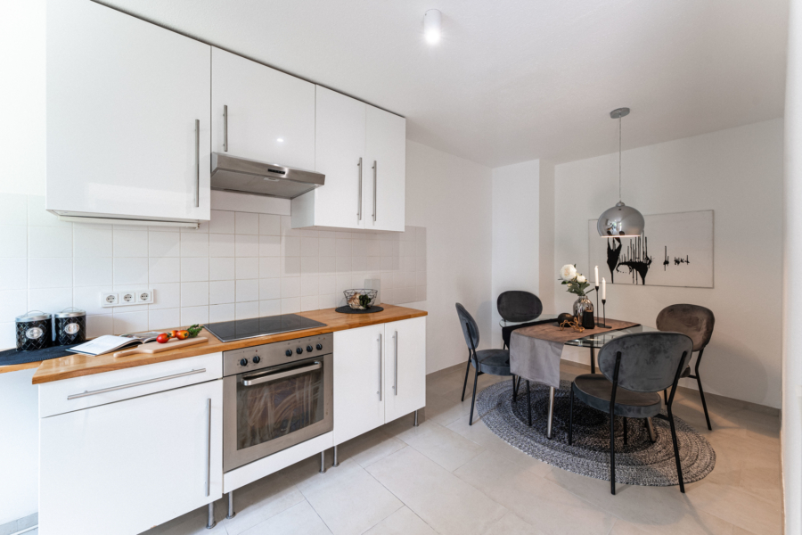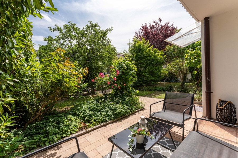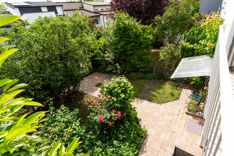 Im Erdgeschoss erwartet Sie ein heller Wohnbereich mit bodentiefen Fenstern, die den Blick direkt auf die gemütliche Terrasse und den gemütlichen, kaum einsehbaren Garten freigeben - ein wunderbarer Ort für entspannte Stunden im Freien. Ihre Kinder können hier sicher spielen, da nur ein Anliegerweg vor dem Haus verläuft. Die separate Küche ist funktional ausgestattet und bietet Platz für einen Essbereich.