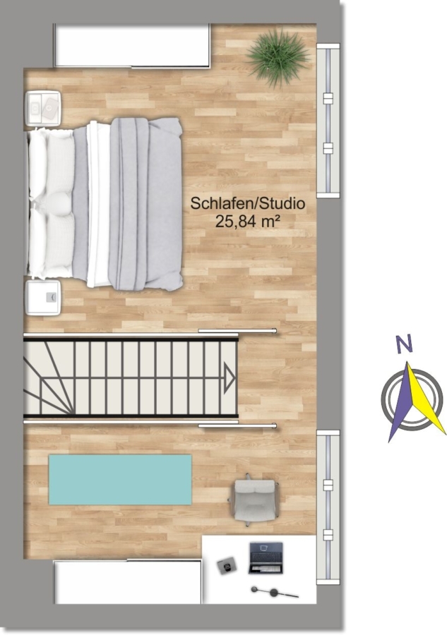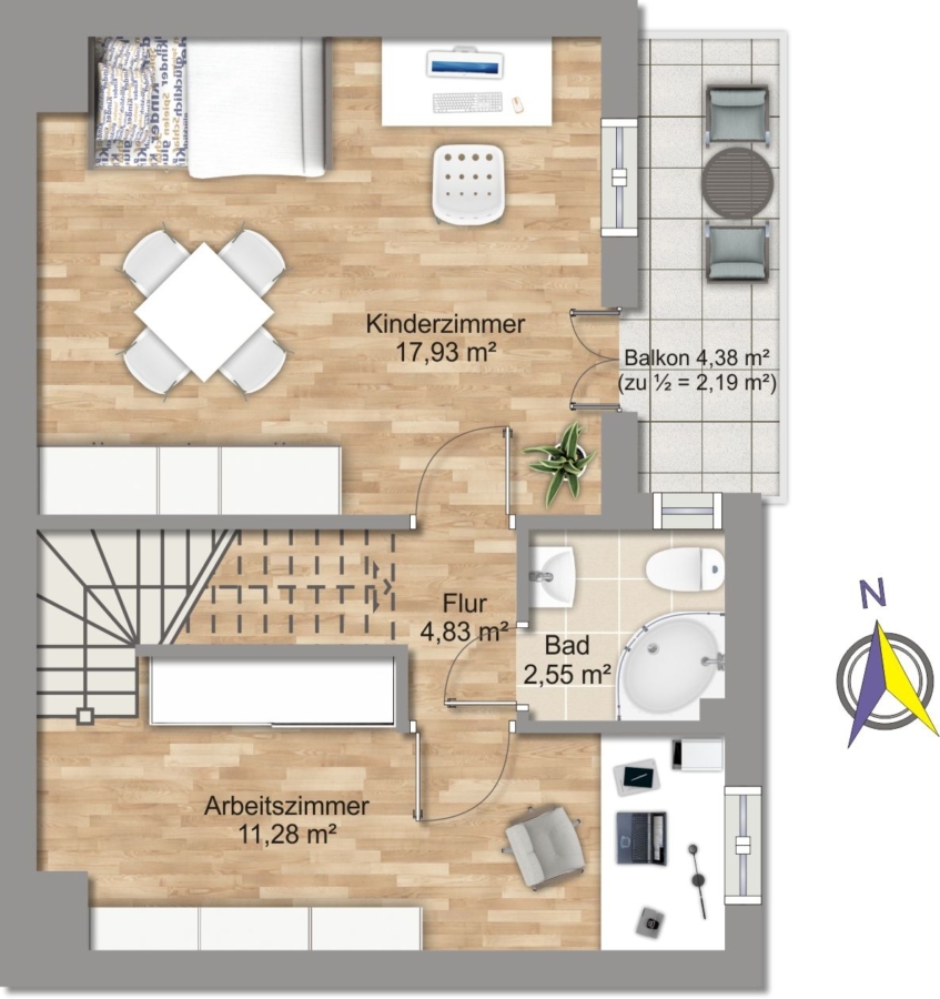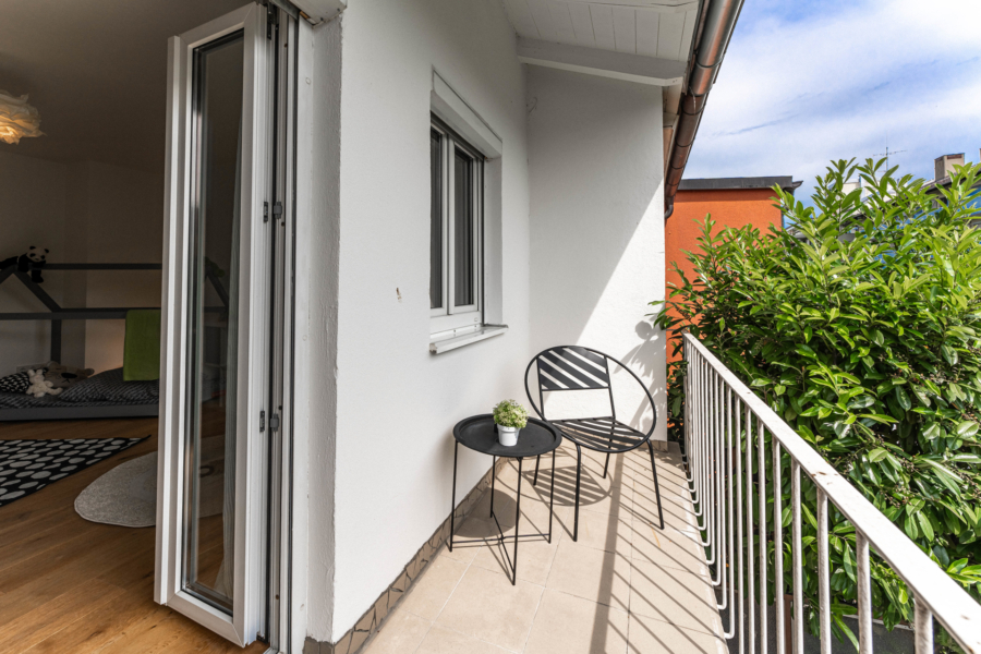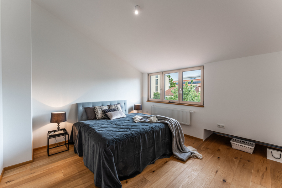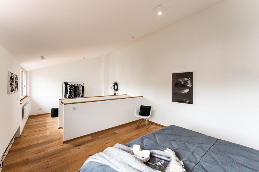 Im Obergeschoss befinden sich ein Schlaf- oder Kinderzimmer mit Balkon, ein kompaktes Duschbad und ein weiteres Zimmer, durch das man die Treppe zum DG erreicht. Das ausgebaute Dachgeschoss ist offen gestaltet, mit hochwertigem Parkettboden und einer stilvollen Holztreppe - ideal als großzügiges Schlafzimmer, Arbeits- oder Rückzugsraum. Hier lassen sich ohne großen Aufwand zwei getrennte Räume realisieren.