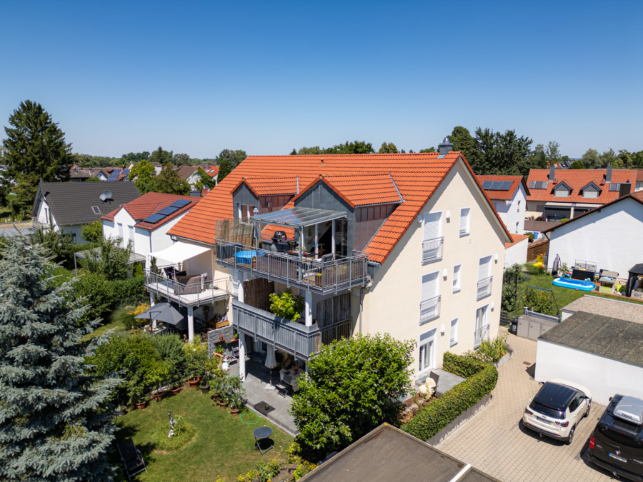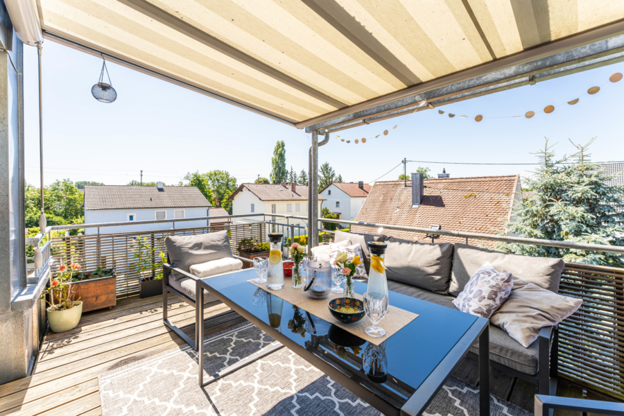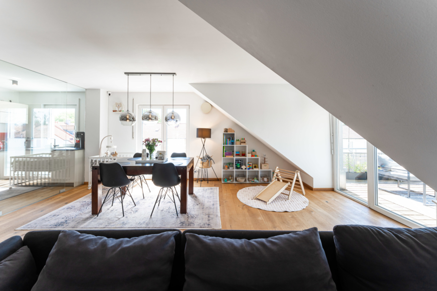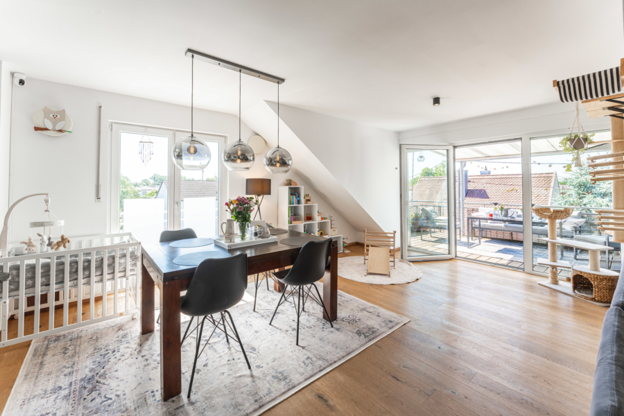Ein besonderes Highlight der Wohnung ist das ca. 44 m² große Wohn-/Esszimmer mit einer großen Süd-Gaube und bodentiefen Fensterelementen zur sonnigen Süd-Terrasse mit Terrassenüberdachung und Sonnenmarkise.