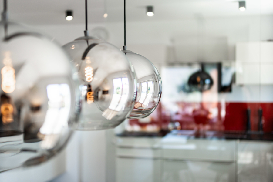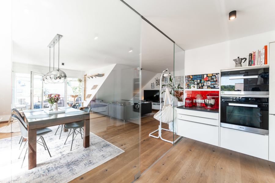 Ein absoluter Blickfang im Wohnzimmer: Die Verglasung mit Schiebetüre zur hochwertigen Einbauküche mit Abstellraum. Die offene Wirkung des gesamten Raumes bleibt erhalten und schenkt dem Raum das besondere Etwas.