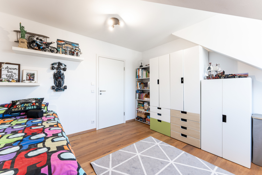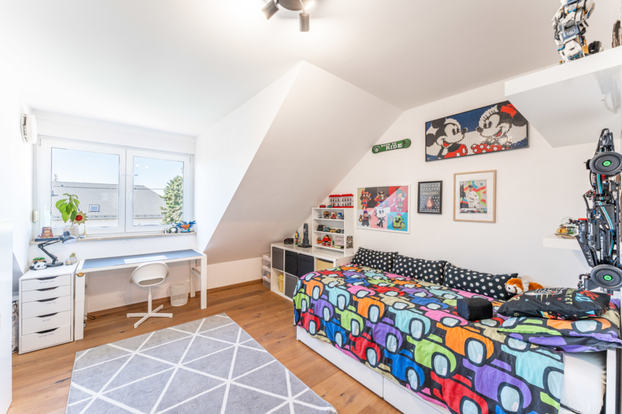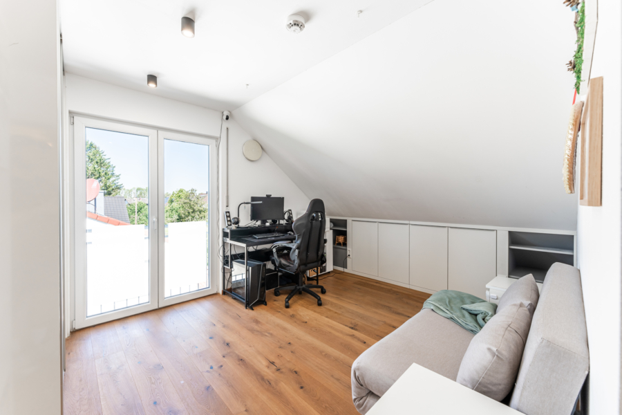 Das dritte Schlafzimmer mit ca. 12 m² befindet sich nach Süden ausgerichtet. Eine große Gaube schenkt diesem Raum viel Licht und zusätzlich Gestaltungsmöglichkeiten.