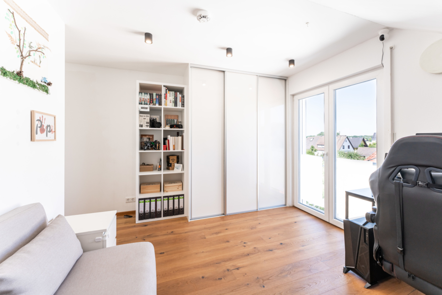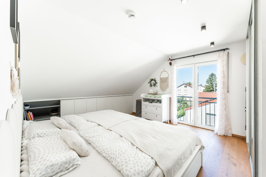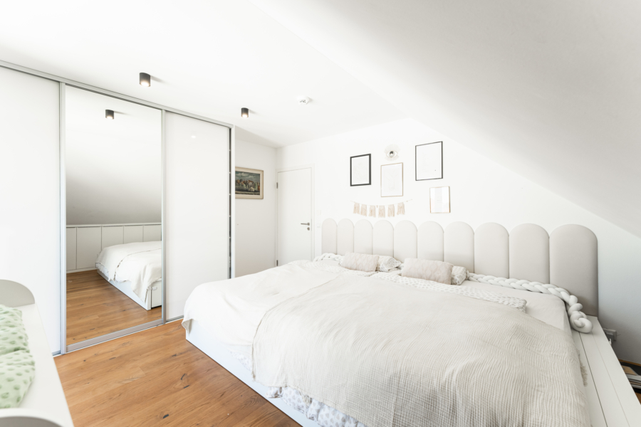 Rechter Hand befinden sich in Westausrichtung zwei große Schlafräume mit bodentiefen Fenstern und hochwertigen Einbaulösungen in den Kniestöcken.