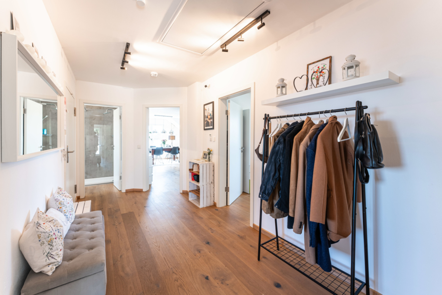 Sofort fällt der hochwertige Eichenparkett-Dielenboden auf, der durchgehend bodenplan in alle Räume verlegt worden ist.