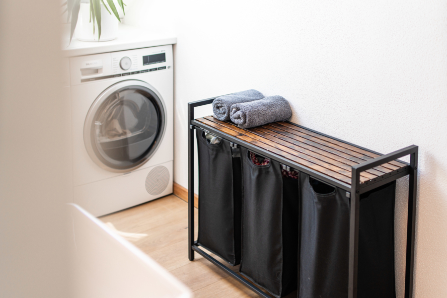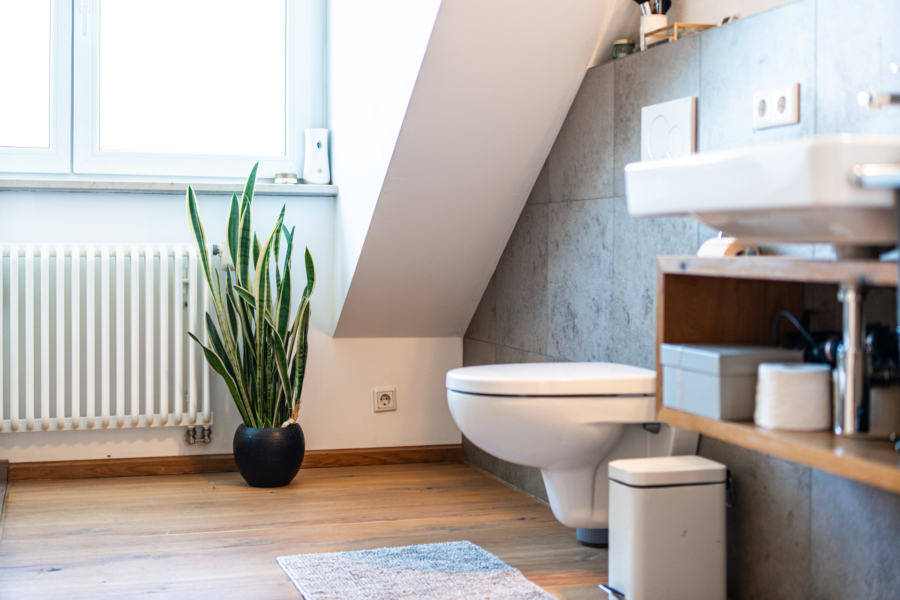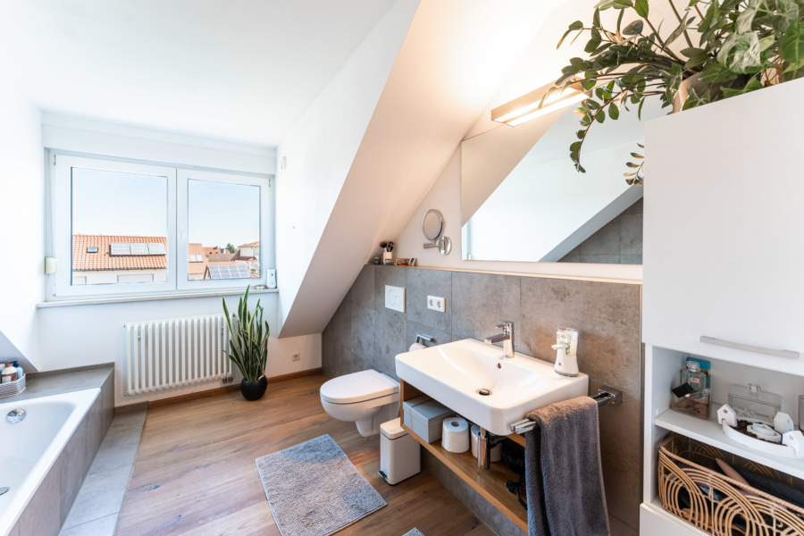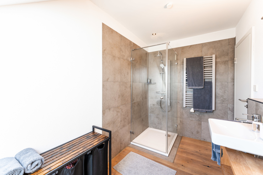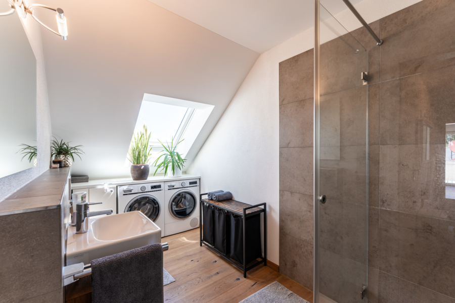 Direkt danebenliegend nach Norden ausgerichtet gibt es das Haupt-Bad mit großem Dachfenster, XXL-Dampfdusche sowie eine Wanne, Waschtisch und ein WC. Das zweite Tageslicht-Bad ist mit einer großen Dusche, sowie ebenfalls Waschtisch und WC ausgestattet. Die geschickte Schreiner-Einbaulösung für die Waschmaschine und den Trockner fällt sofort auf.