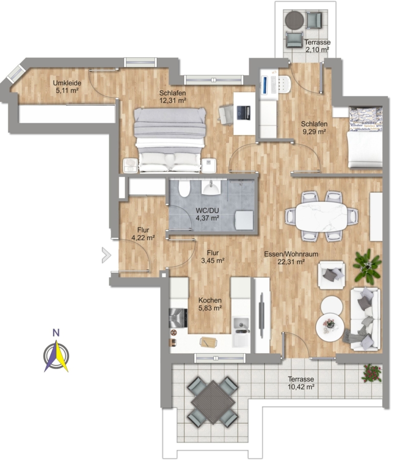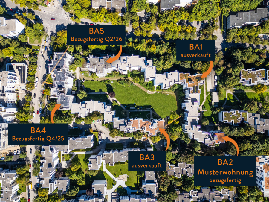 Die hellen Räume mit Höhen von ca. 2,60 m profitieren von großen Fenstern, und jede Wohnung verfügt über eine großzügige Terrasse in Süd- oder Westausrichtung.