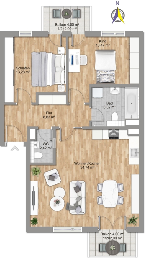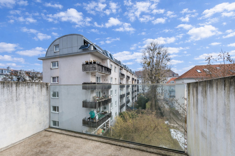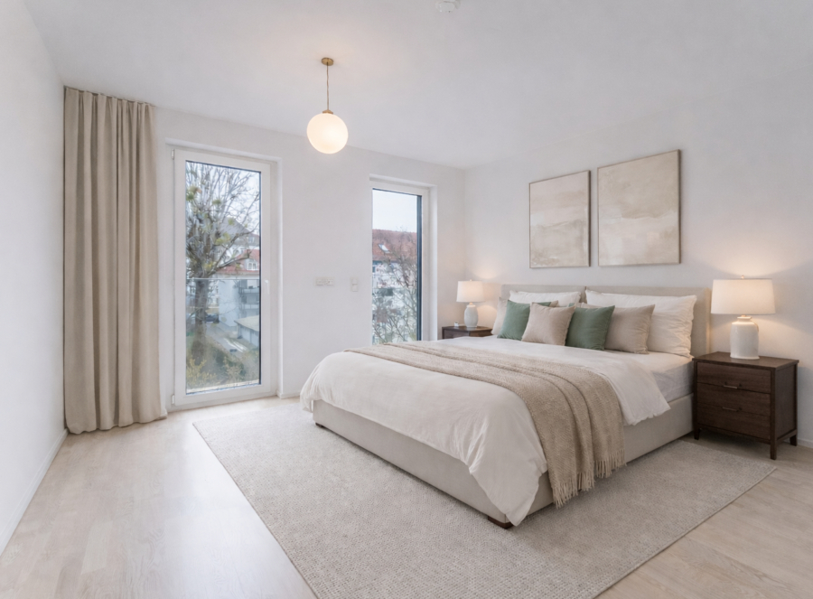 Die Wohnung besticht durch ihre Helligkeit und Offenheit – dank der bodentiefen Fenster genießen Sie den ganzen Tag über die Sonne und den Blick auf den angrenzenden Luitpoldpark. Besonders hervorzuheben sind die zwei Balkone: Der Südwestbalkon, der vom Wohnzimmer und der Küche aus zugänglich ist, lädt zu entspannten Stunden am Nachmittag ein, während der Ostbalkon von beiden Schlafzimmern aus den perfekten Start in den Tag mit Sonnenaufgang bietet.