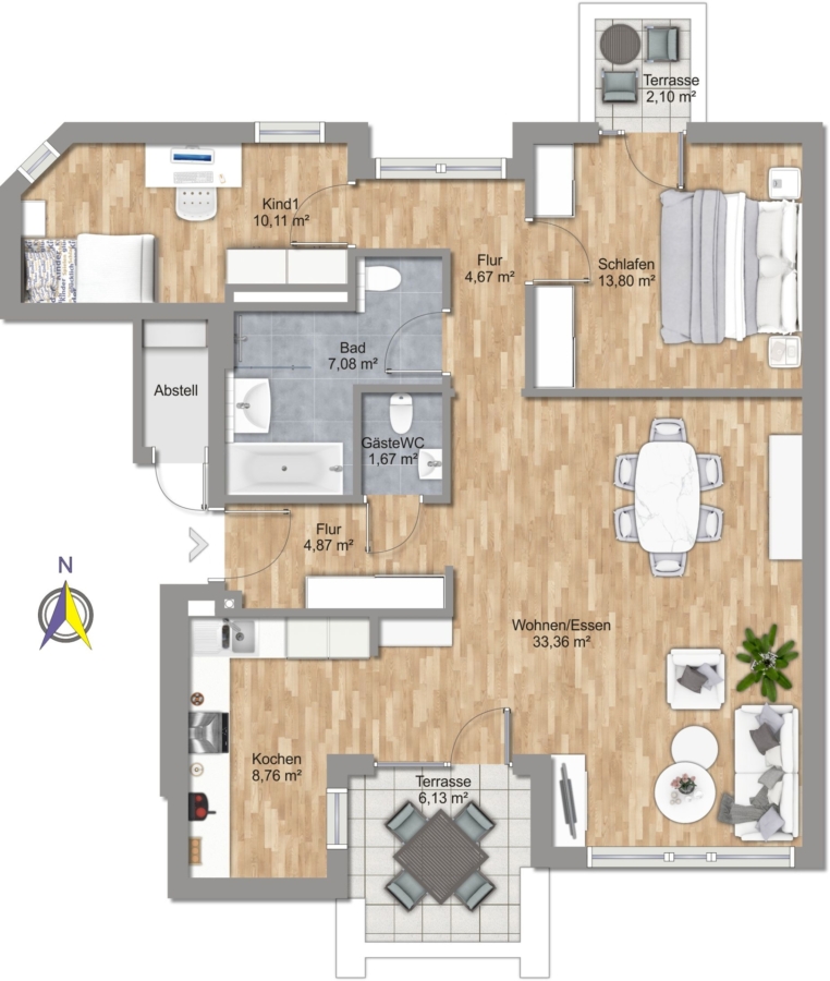 Die hellen Räume mit Höhen von ca. 2,60 m profitieren von großen Fenstern, und jede Wohnung verfügt über eine großzügige Terrasse in Süd- oder Westausrichtung.