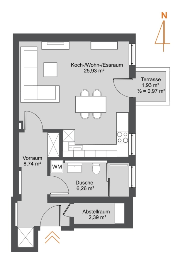 Das hochwertig ausgestattete Neubau-Penthouse-Apartment bietet mit einer Wohnfläche von ca. 43 m² eine optimale Größe und Raumaufteilung. Der Eingangsbereich bietet Platz für eine Garderobe und einen zusätzlichen Stauraum. Das geräumige Tageslicht-Bad überzeugt mit einem Waschmaschinenanschluss und einer großen, bodengleichen Dusche. Der Wohnraum mit offener Küche ist zum ruhigen Innenhof ausgerichtet. Ein kleiner Balkon ergänzt die Vorzüge dieser Immobilie.