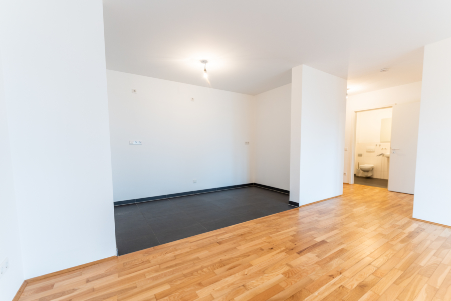 Der großzügige Wohn- und Essbereich mit Zugang zur Terrasse bietet viel Platz für individuelle Gestaltung. Dank der bodentiefen Fenster fällt viel Tageslicht in die Räume, was ein freundliches Ambiente schafft. Die angrenzende Küche ist offen gehalten und wird vom Vermieter noch mit einer neuen Einbauküche ausgestattet.
