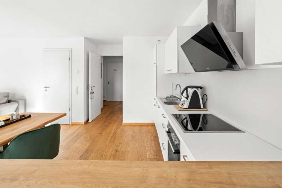 Die moderne Einbauküche fügt sich stilvoll ins Gesamtbild ein und ist bereit für Ihre kulinarischen Idee. Ein schönes Detail ist der kleine Hochtisch, der sich perfekt für ein schnelles Frühstück, den Kaffee zwischendurch oder ein gutes Gespräch beim Kochen eignet. Zwei Barhocker platziert und fertig ist Ihre Gourmet-Theke.