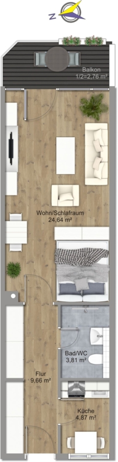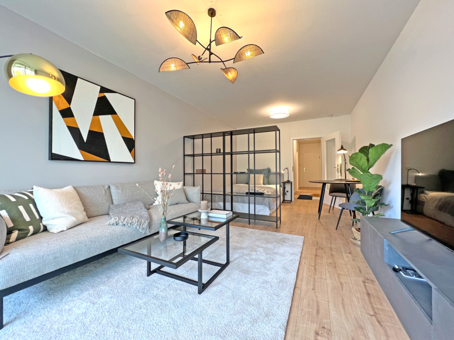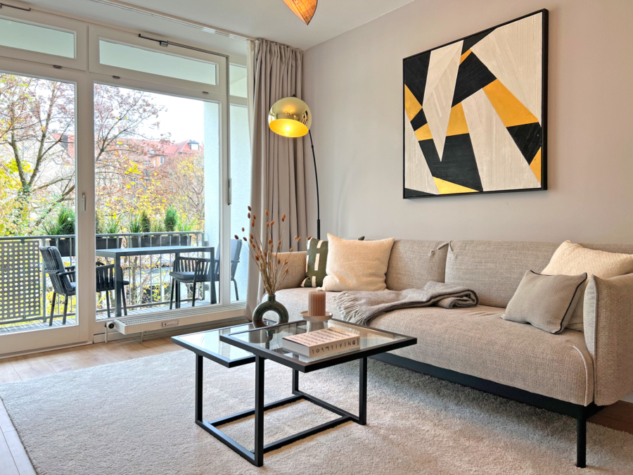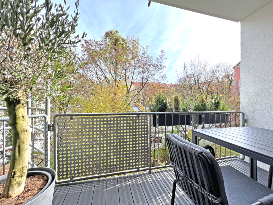 Das Wohnzimmer mit der großen Fensterfront ist geschickt unterteilt in einen Schlafbereich, einen Ess-/Arbeitsplatz und den gemütlichen Wohnbereich. Sie blicken hinaus in den grünen Hinterhof. Auf dem Balkon genießen Sie die Ruhe – gefühlt weit weg vom Trubel der Stadt. Und trotzdem sind Sie mittendrin zwischen Isar und Englischem Garten...