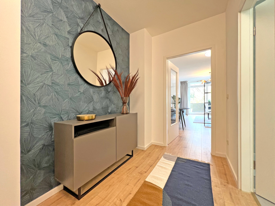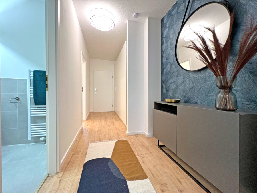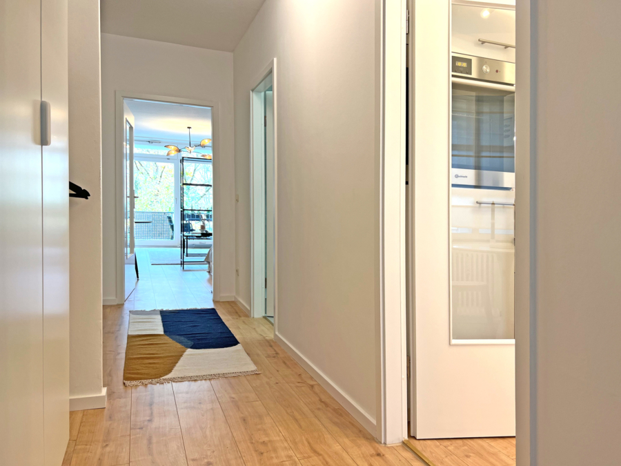 Das Apartment befindet sich im 2.OG (mit Lift) und wurde renoviert und neu eingerichtet. Im Flur gibt es einen praktischen Garderoben-/Haushalts-/Kleiderschrank und ein Sideboard für Ihre Kleinigkeiten. Die Küche ist mit einer kompakten Küchenzeile und einem Bistrotisch ausgestattet.